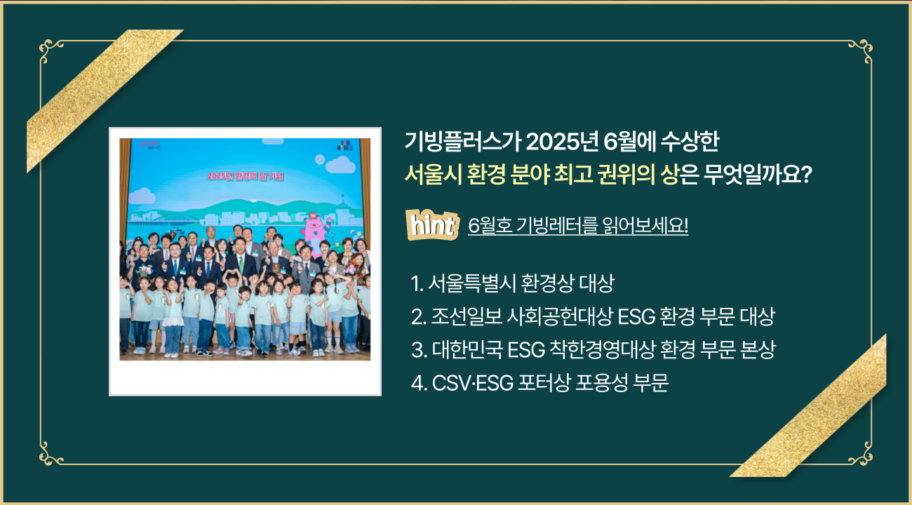 재단법인 기빙플러스가 서울시 환경 분야 최고 권위의 2025 서울특별시 환경상 '대상'을 수상하는 영예를 안았습니다🏆 1997년 시작돼 올해로 29회를 맞이한 '서울특별시 환경상'은 쾌적한 서울의 환경 조성, 기후위기 대응 및 저탄소 활동에 기여한 개인·단체·기업의 공적을 널리 알리고, 지속 가능한 환경 실천 문화를 확산하기 위해 마련된 상입니다. 기빙플러스는 친환경 나눔스토어를 통해 버려지는 자원을 환경보호와 취약계층 지원으로 연결하는 새로운 순환경제 모델을 제시해왔습니다. ESG 기반의 나눔 사업을 통해 자원순환 문화 확산과 탄소 감축, 취약계층 일자리 창출에 기여한 점을 높이 평가받을 수 있었던 이유는, 기업 및 지역사회 시민 모두 미래의 지속성을 위해 함께해 주셨기 때문이라고 생각합니다. 앞으로도 지속 가능한 환경 조성과 사회적 가치 창출을 위해 모범사례를 발굴하며 책임을 다하겠습니다. 감사합니다!